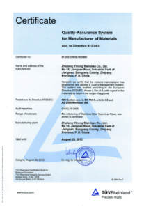公司嚴格按ISO9001:2015《質量管理體系—要求》、ISO14001:2015《環(huán)境管理體系 要求及使用指南》、ISO 45001:2018《職業健康管理體系 要求及使用指南》和TSG 07—2019《特種設備生產和充裝單位許可規(guī)則》,建立完善的管理體系。公司擁有國內較大的12000KN冷拔機組和先進的全溫控不銹鋼固溶退火爐等生產設備,同時具有ET16-159渦流探傷儀、UT16-159超聲波探傷儀、UT159-830超聲波探傷儀、H159-630水壓試驗機、WAD—600液壓材料試驗機、4XB電腦金相顯微鏡、JQ—300沖擊試驗機、HBRVU—187.5硬度計、島津光譜儀、化學分析儀、晶間腐蝕試驗等完善的檢測設備。